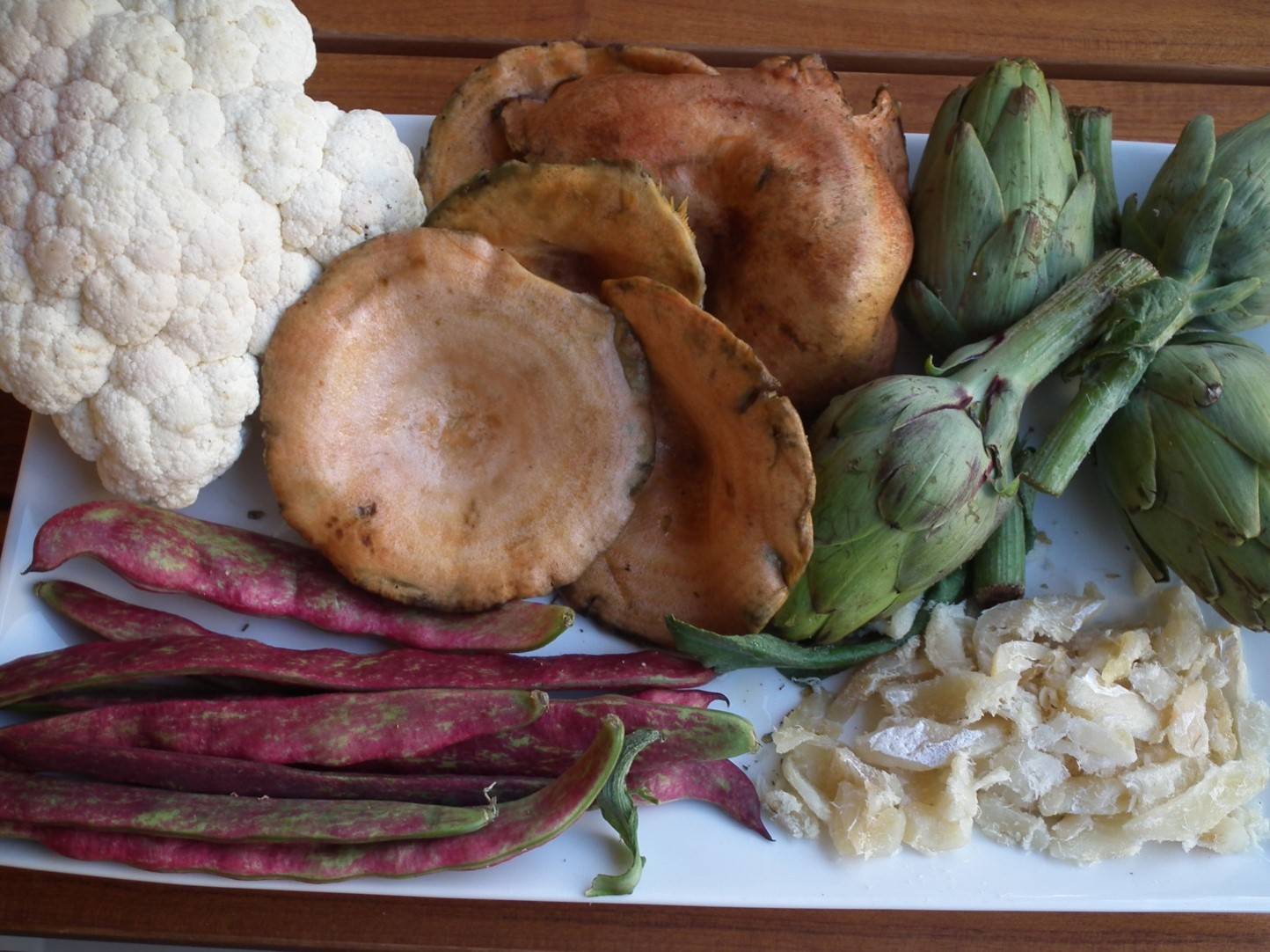 Quando l'olio è caldo, aggiungere le verdure e il baccalà. Verranno aggiunti uno ad uno ogni due minuti circa, in modo da cuocere uniformemente gli ingredienti. Si comincia con il cavolfiore, due minuti dopo il carciofo, poi il baccalà, i fagiolini, il pomodoro al naturale e 12 minuti dopo le cappelle allo zafferano che richiedono meno tempo..