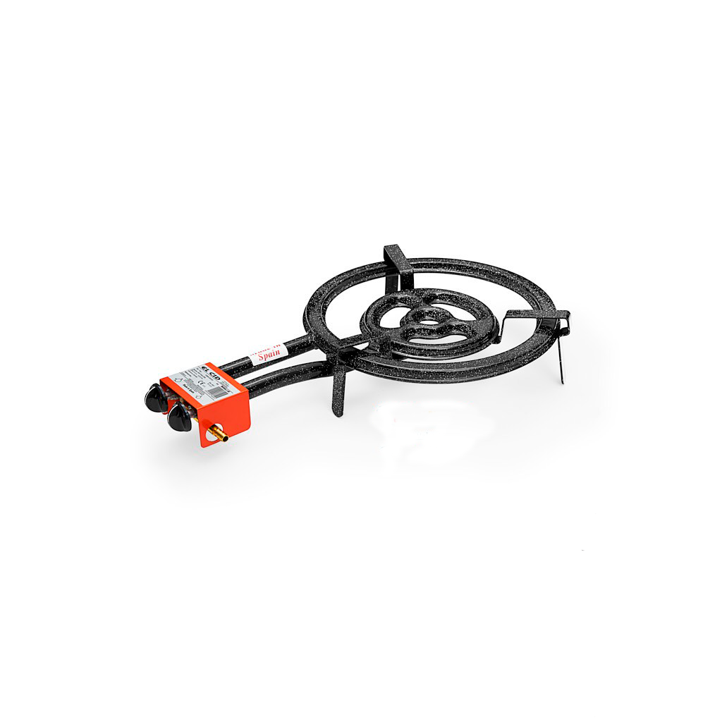 Bruciatore a gas atmosferico con supporto integrato (anello paellero) per uso esterno. L'apparecchio è progettato per riscaldare contenitori o piatti contenenti liquidi o alimenti. E' dotato di x bruciatori circolari concentrici, uniti tra loro da x gambe fisse, che sostengono il tutto, garantiscono la stabilità dell'apparecchio e fungono da supporto per i recipienti di cottura (paella, bistecchiere, padelle, arrosti, ecc.).