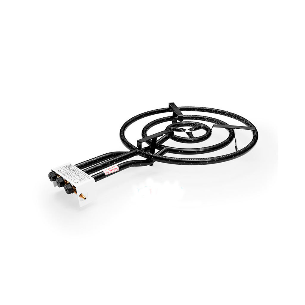 Questo bruciatore di gas di 60 cm ha tre anelli concentrati e tre controlli. L'anello esteriore è di 60 cm, l'anello centrale è di 40cm e l'anello interiore di 20 cm. che garantiscono che il calore si distribuisca uniformemente sulla base della padella o pentola per paella. Si possono utilizzare gli anelli di forma indipendente. In caso di utilizzo dell'anello interiore si raccomanda di proteggere quello esteriore per evitare ostruzione.